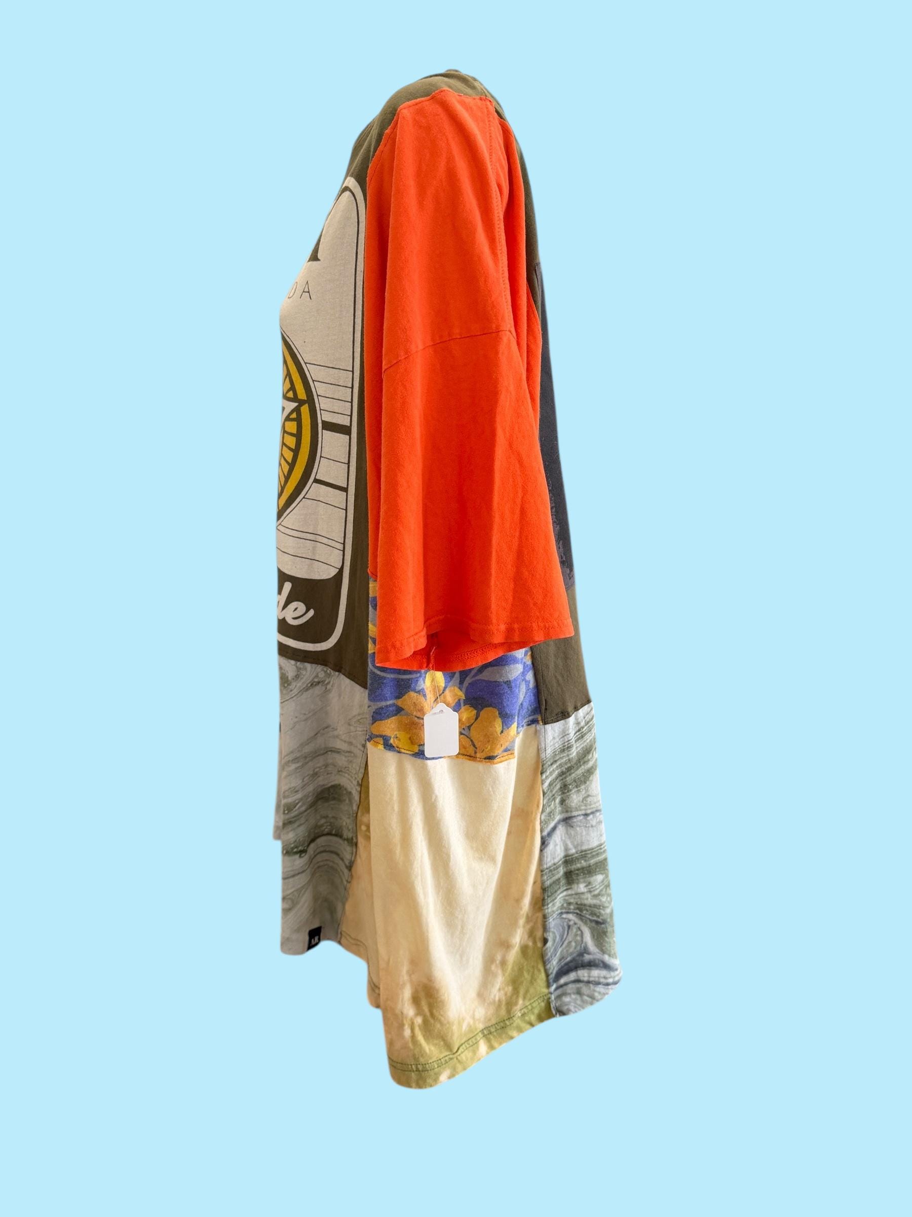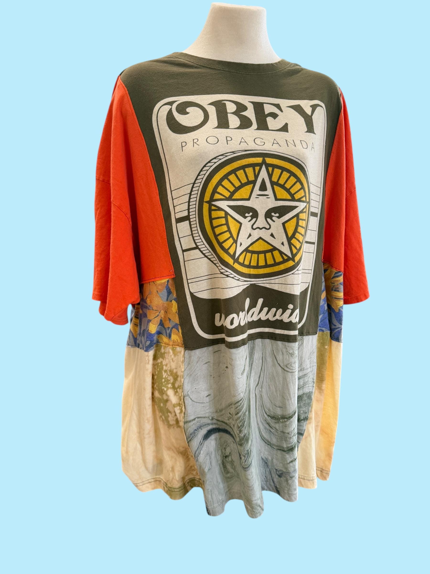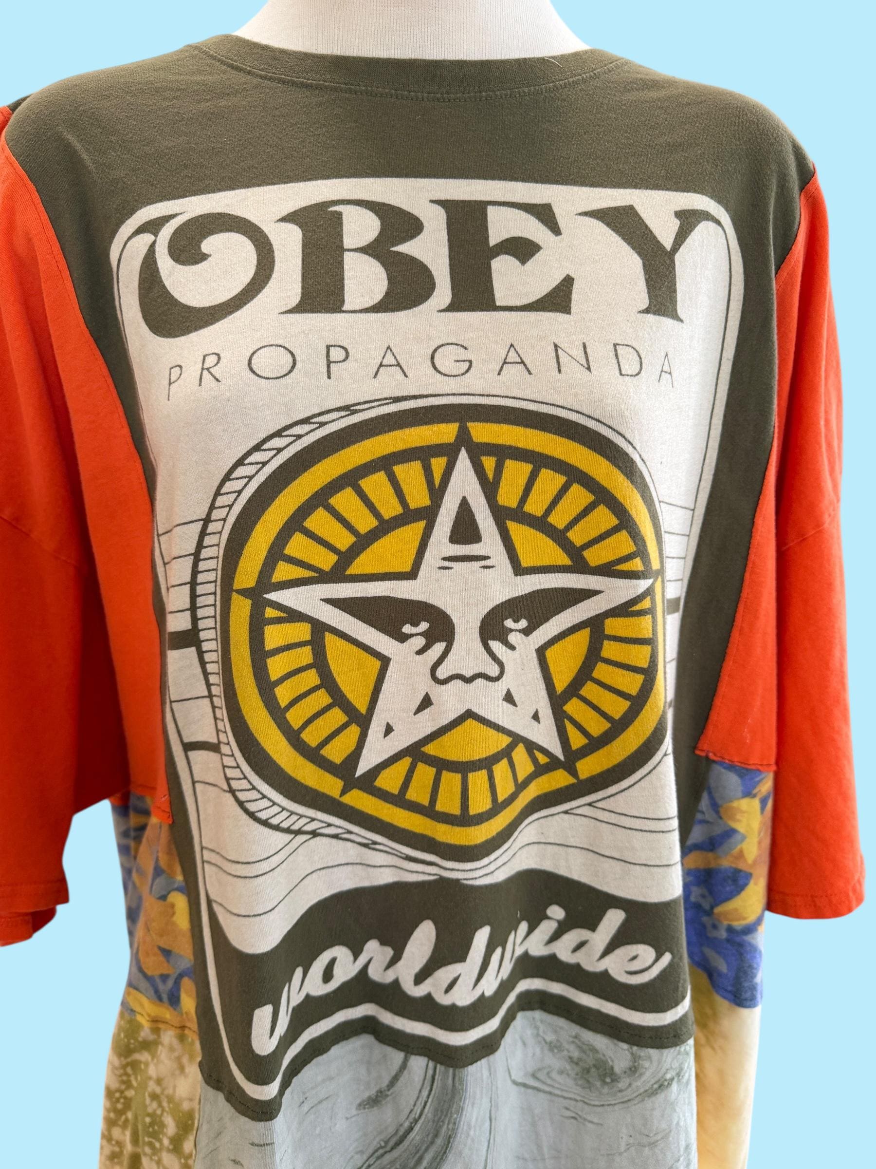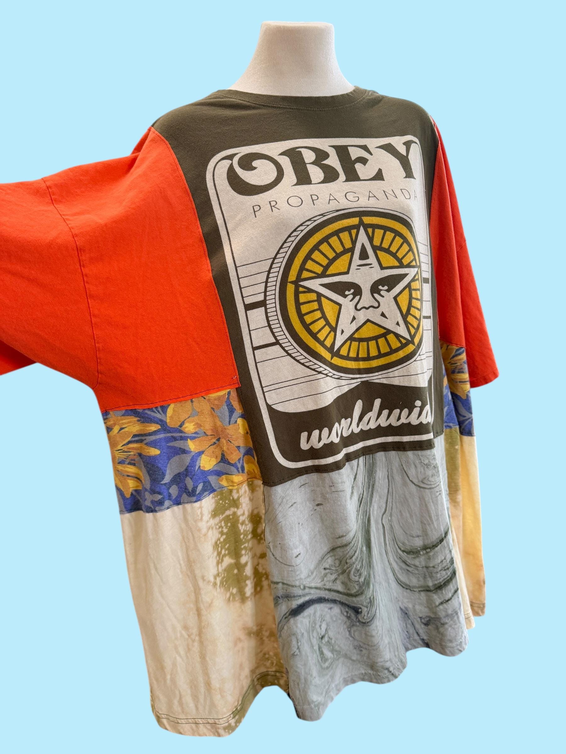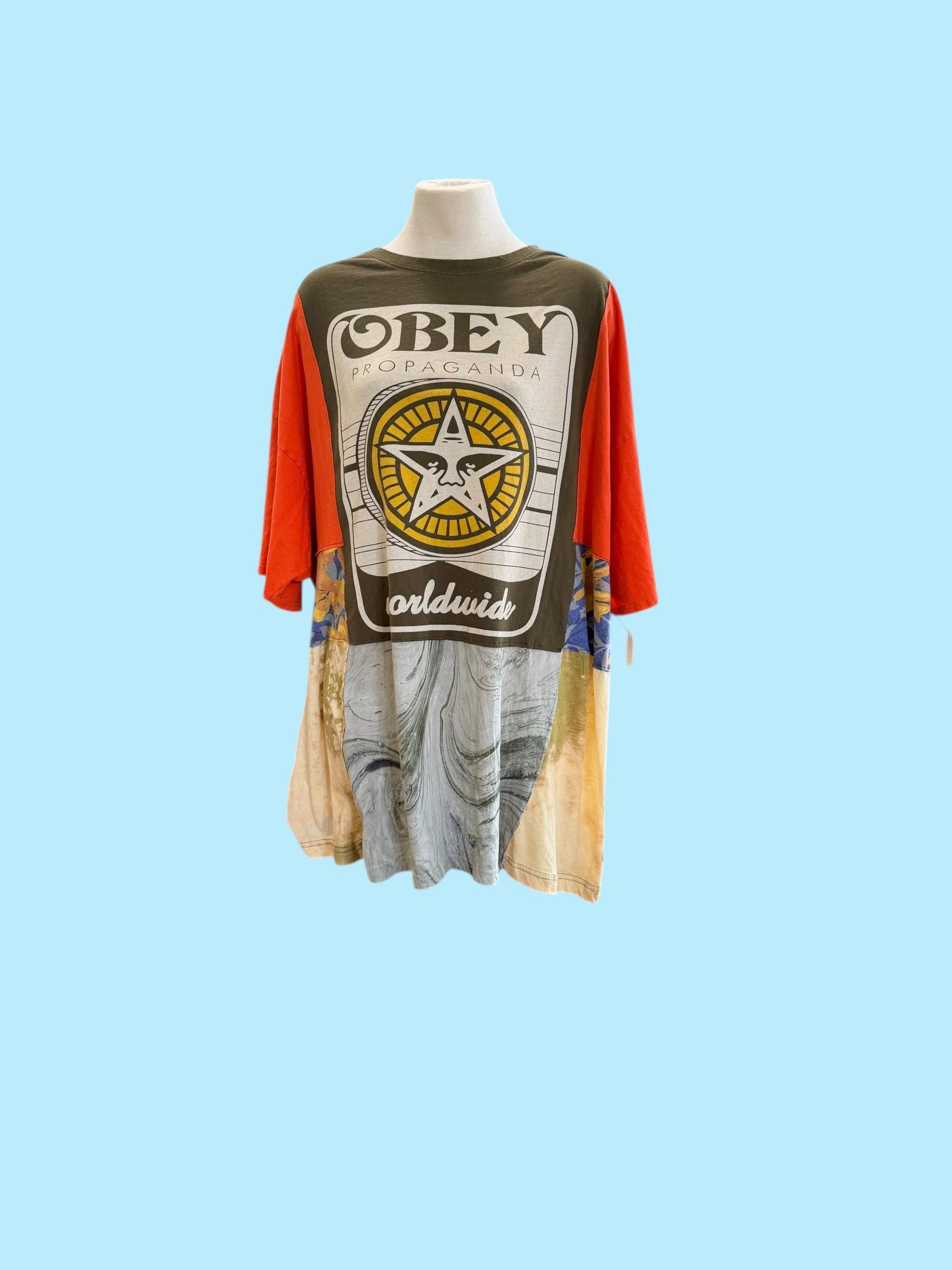 This Obey shirt was upcycled with funk in mind. I added a cool Tiger listening to music on the back and nature colored t-shirts throughout. Funky and Cool Vibe! This tunic can be worn as a dress for some. Super comfy and easy to wash and dry.Questions message me.