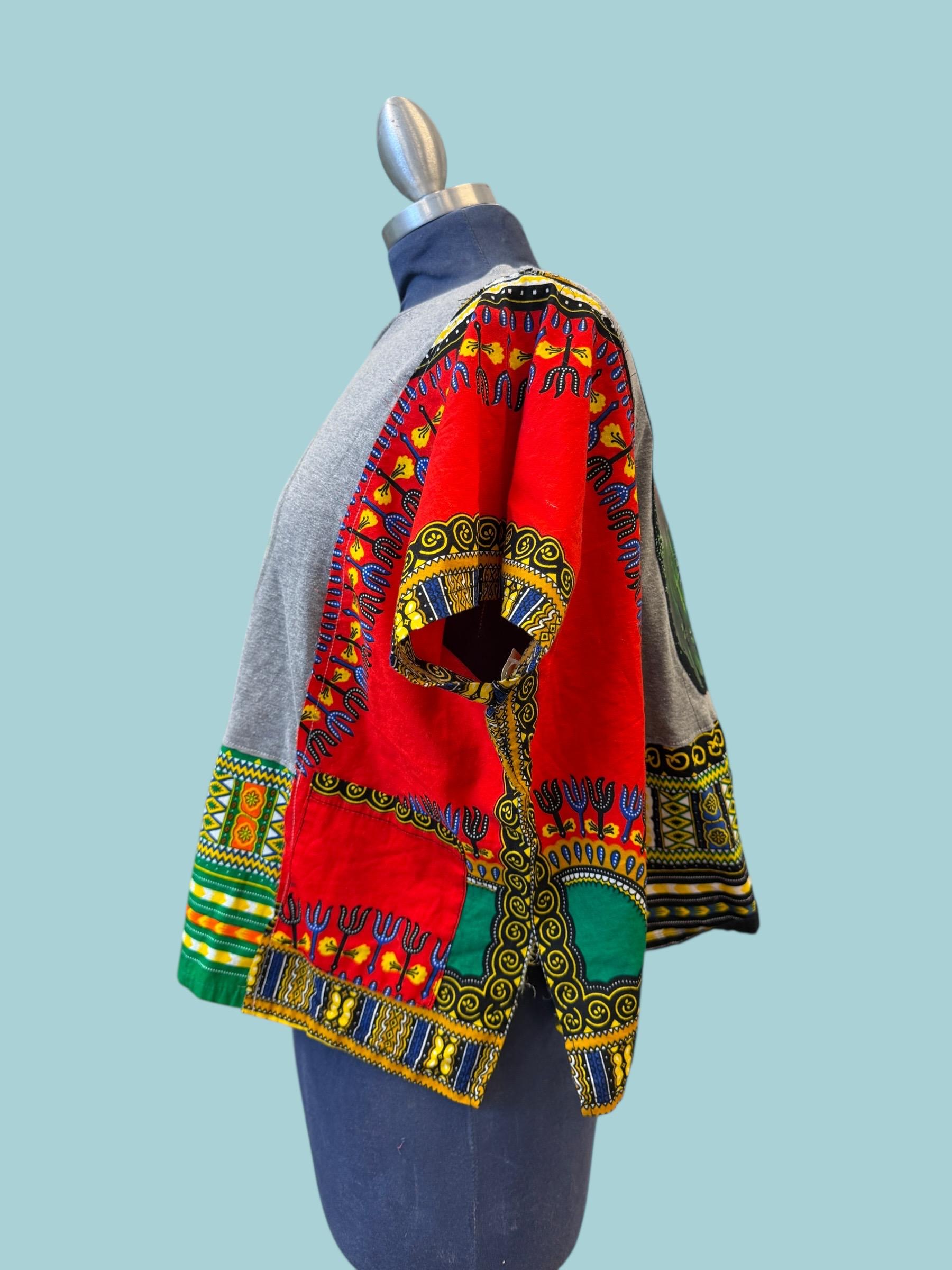 This sweet little t-shirt was up-cycled with a cotton African shirt. I added it to the sides of the t-shirt. I also added a Lion Rasta Graphic to the back. This top is simple but super cute.