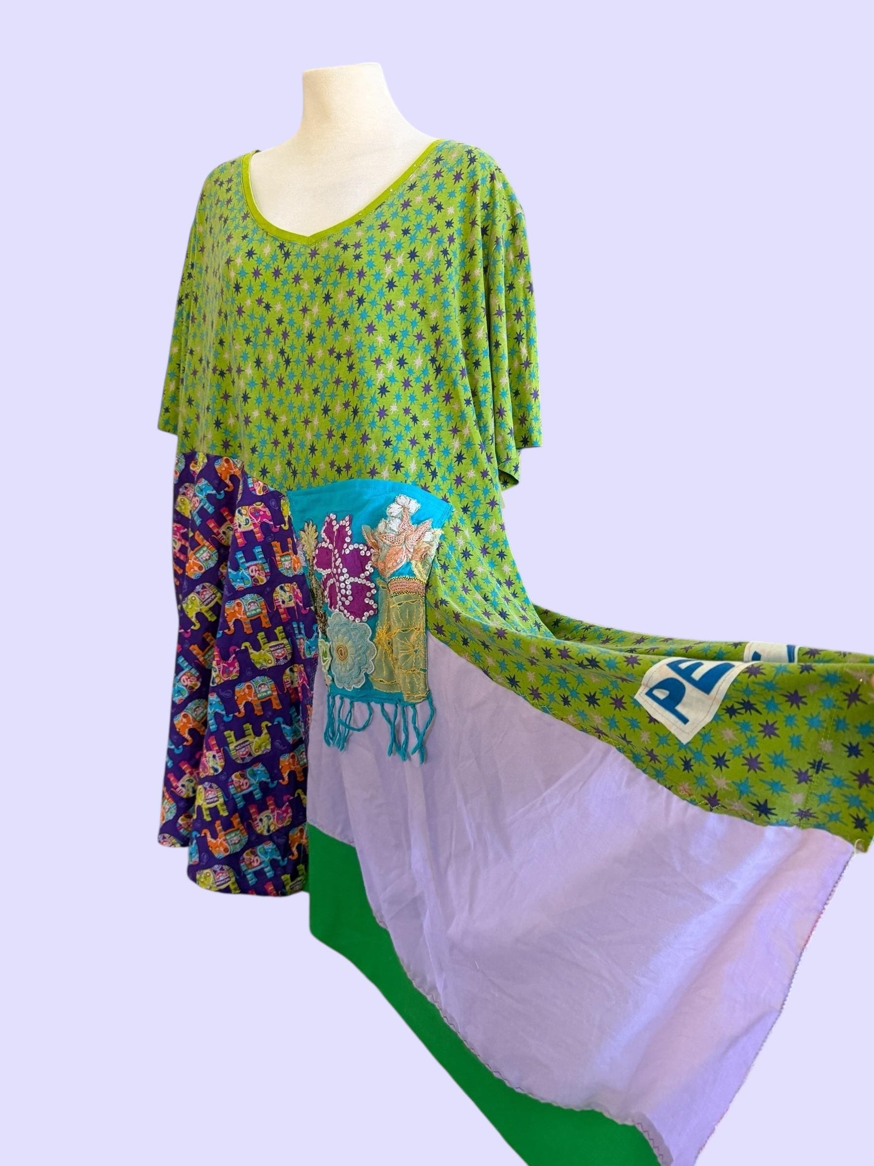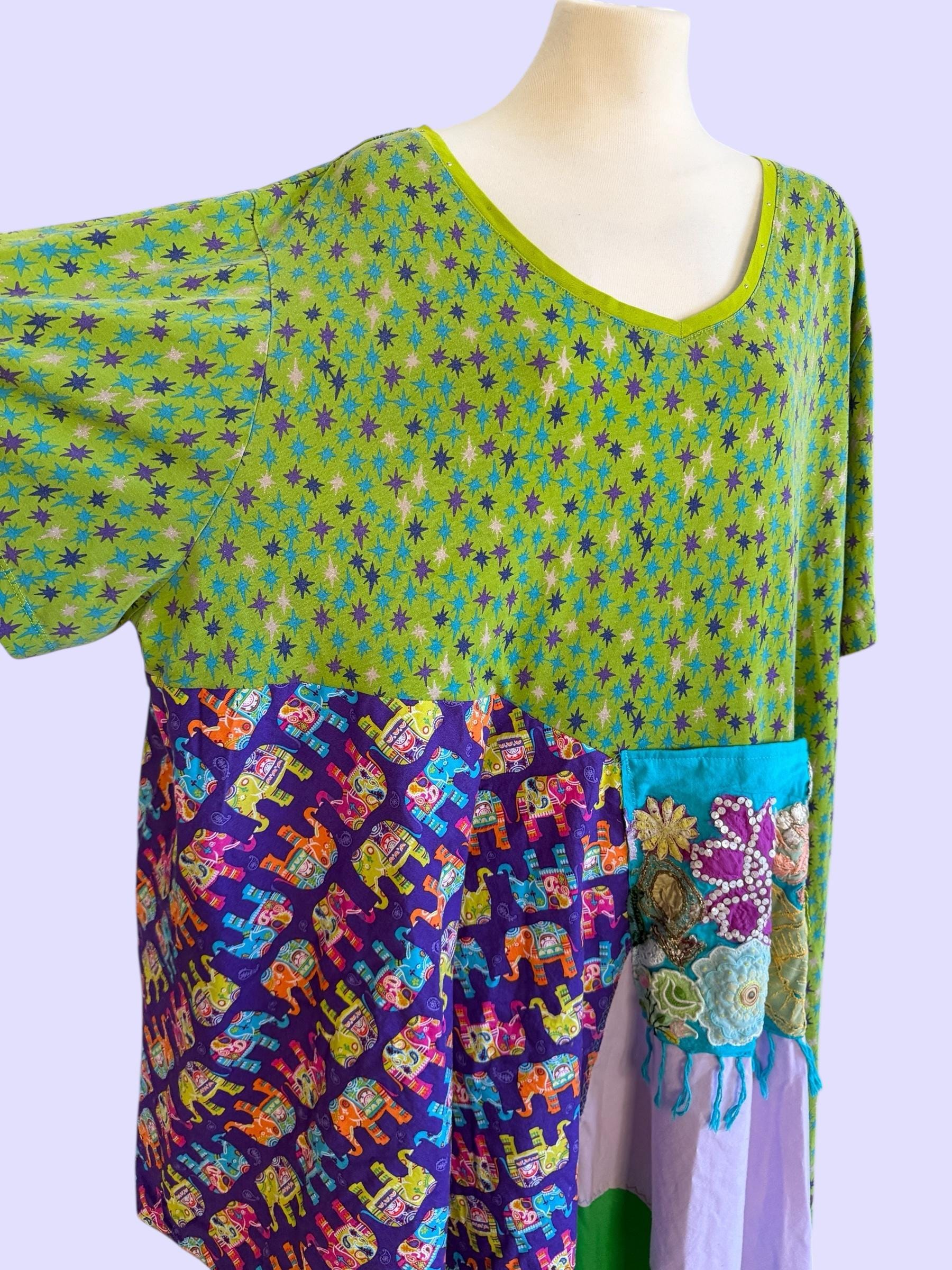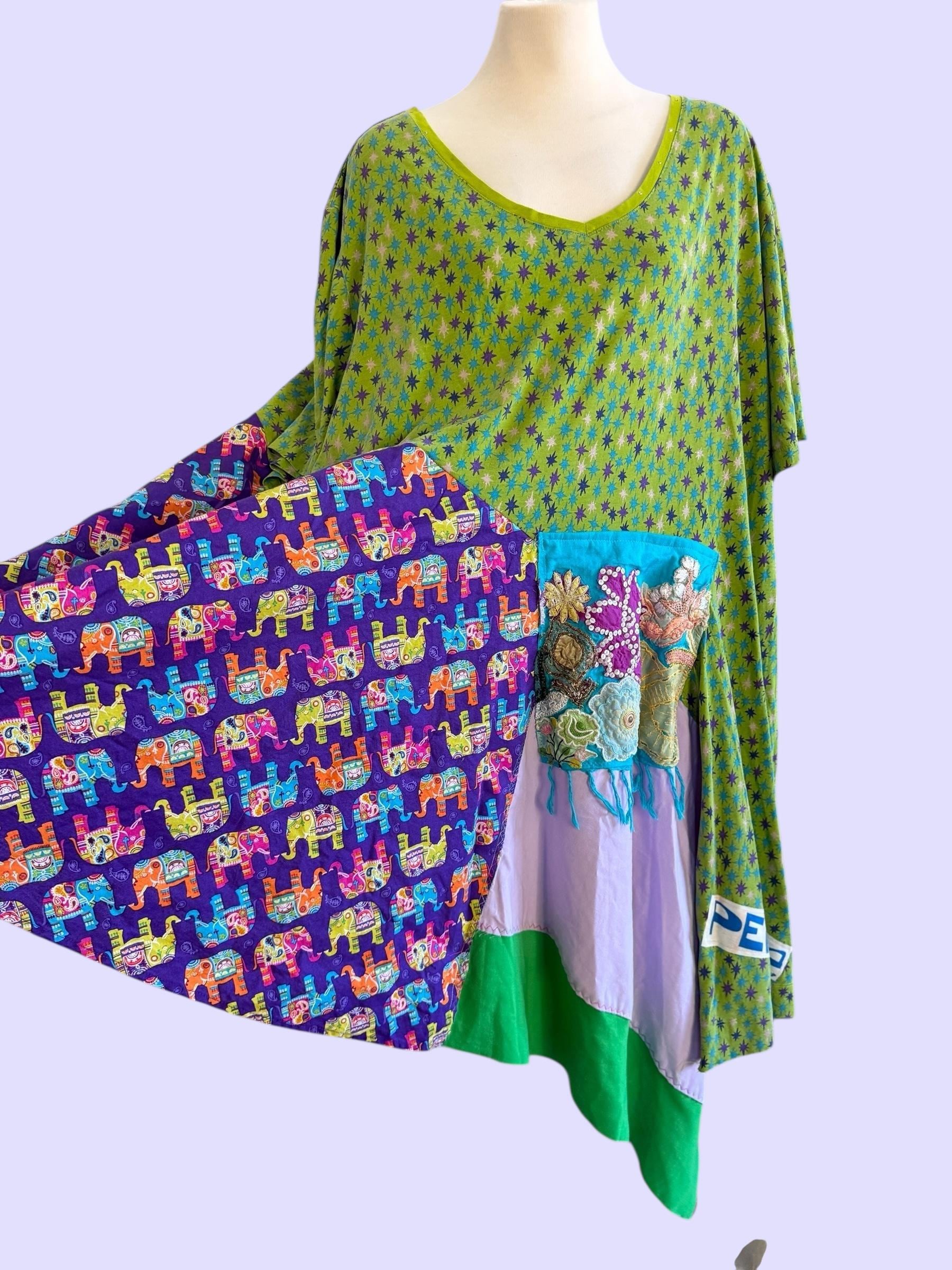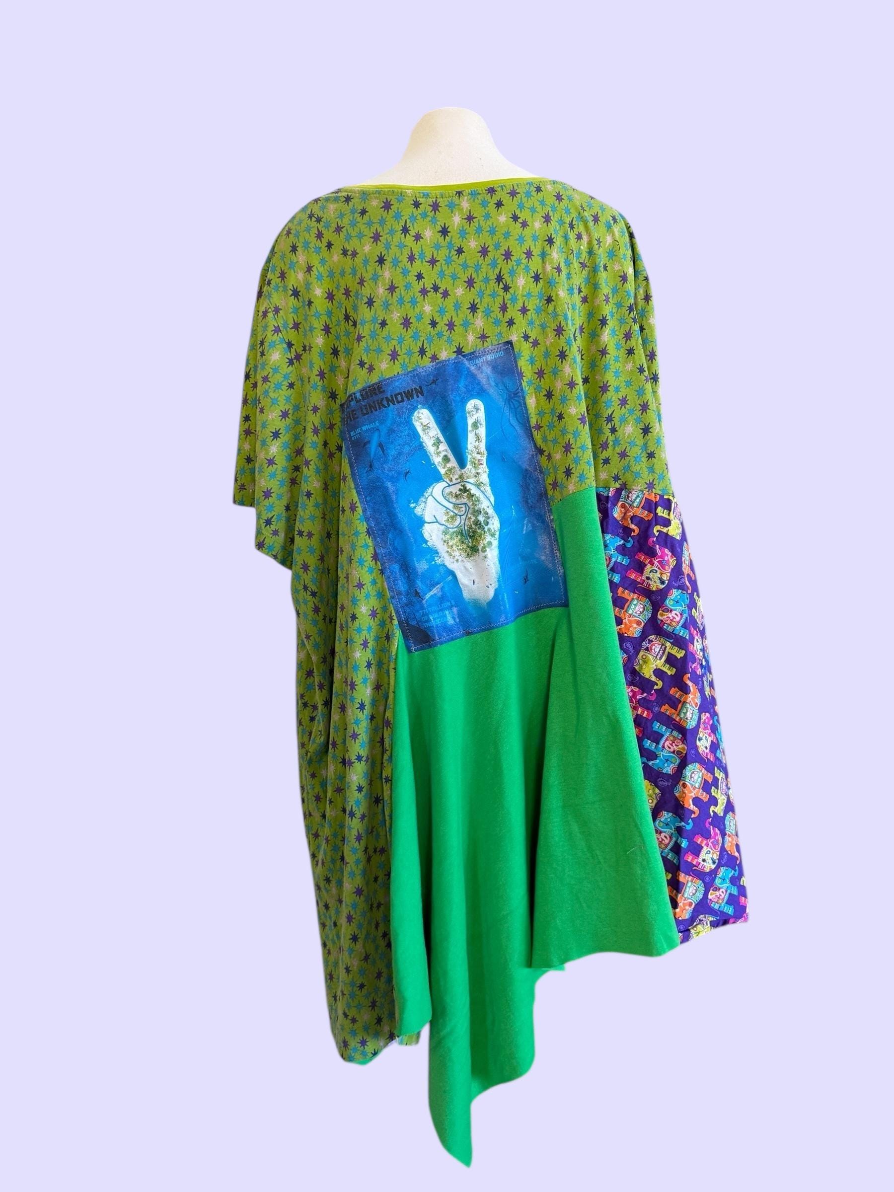 This cool Soft 4XL shirt was up-cycled into a fun whimsical colorful patchwork tunic. If you want to stand out in a crowd and feel peace and love and wear a OOAK design, look no further. The pocket is the coolest!!