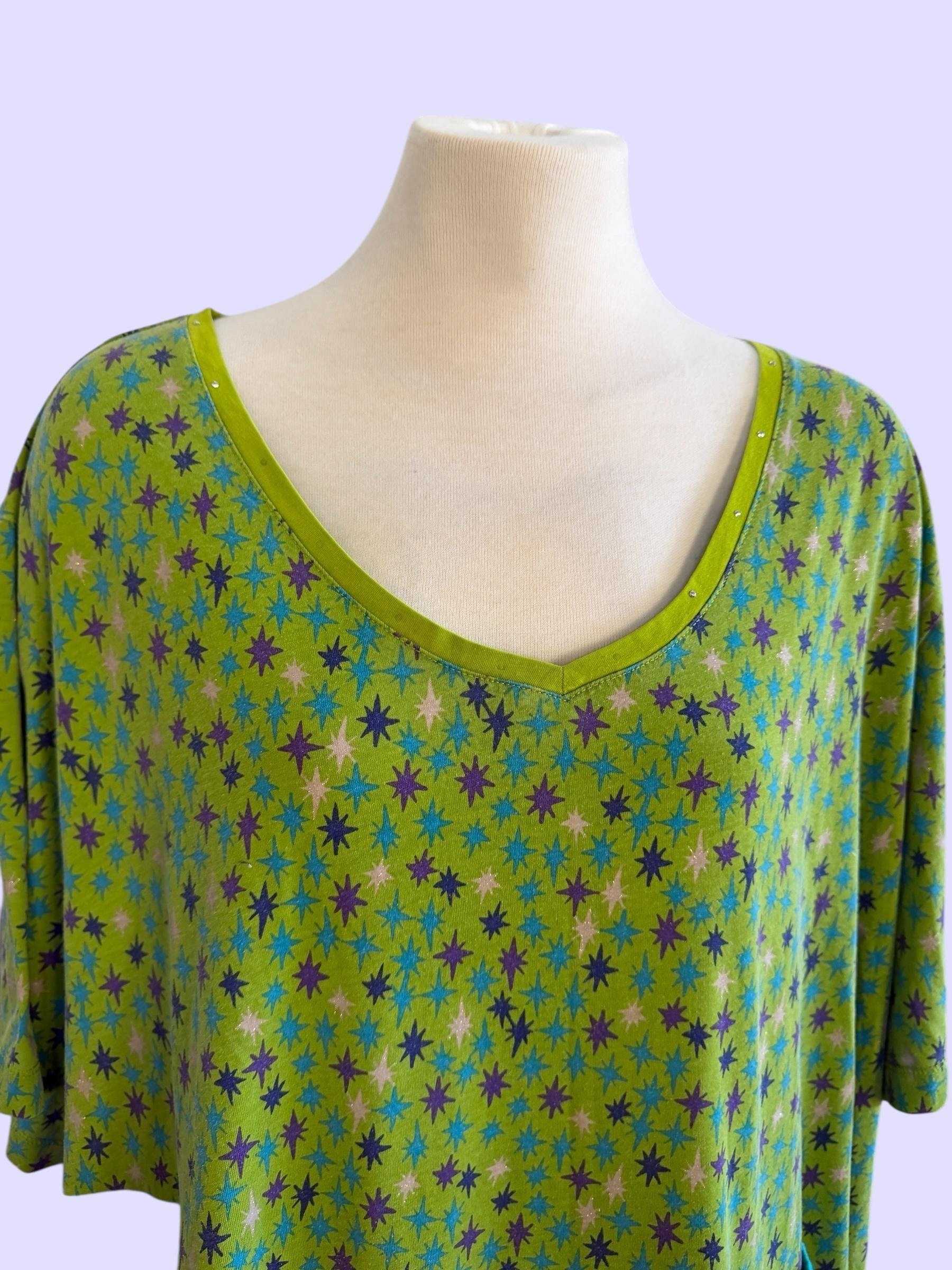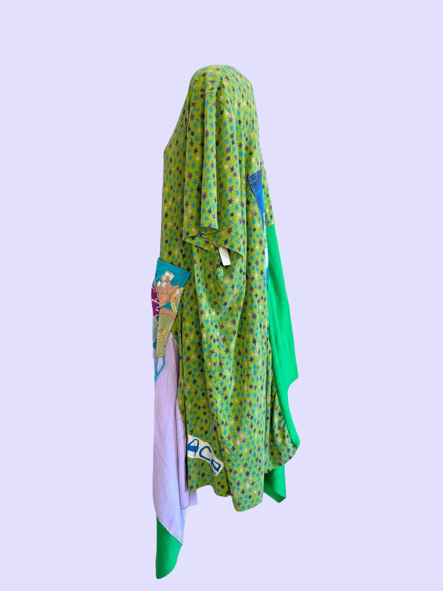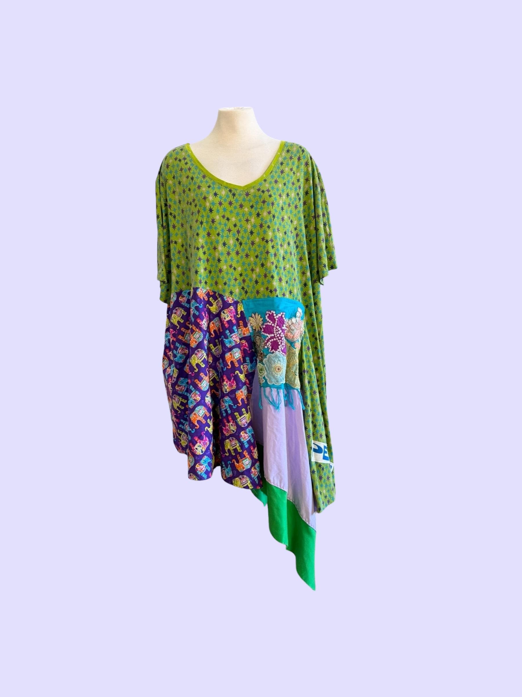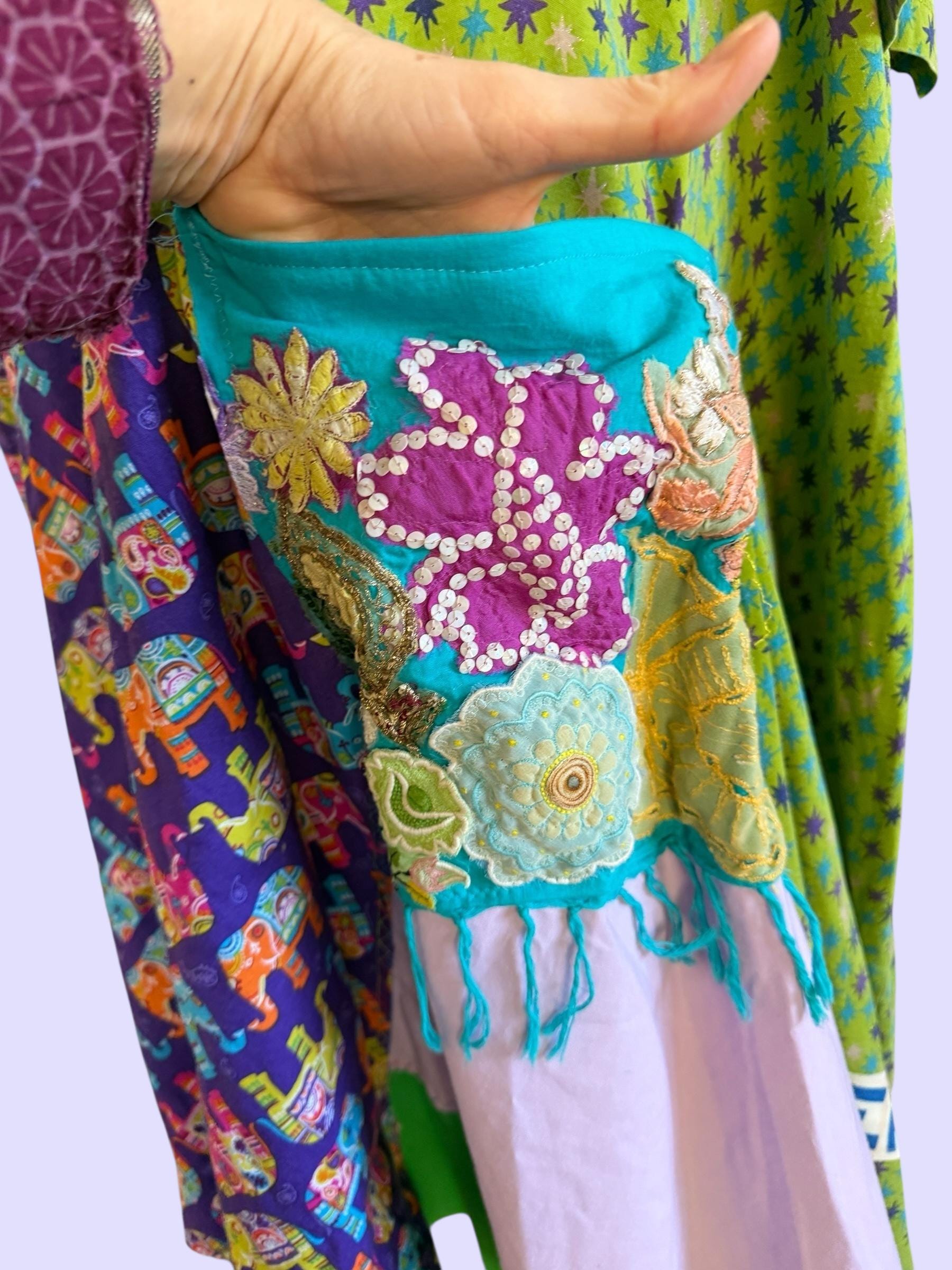 This cool Soft 4XL shirt was up-cycled into a fun whimsical colorful patchwork tunic. If you want to stand out in a crowd and feel peace and love and wear a OOAK design, look no further. The pocket is the coolest!!