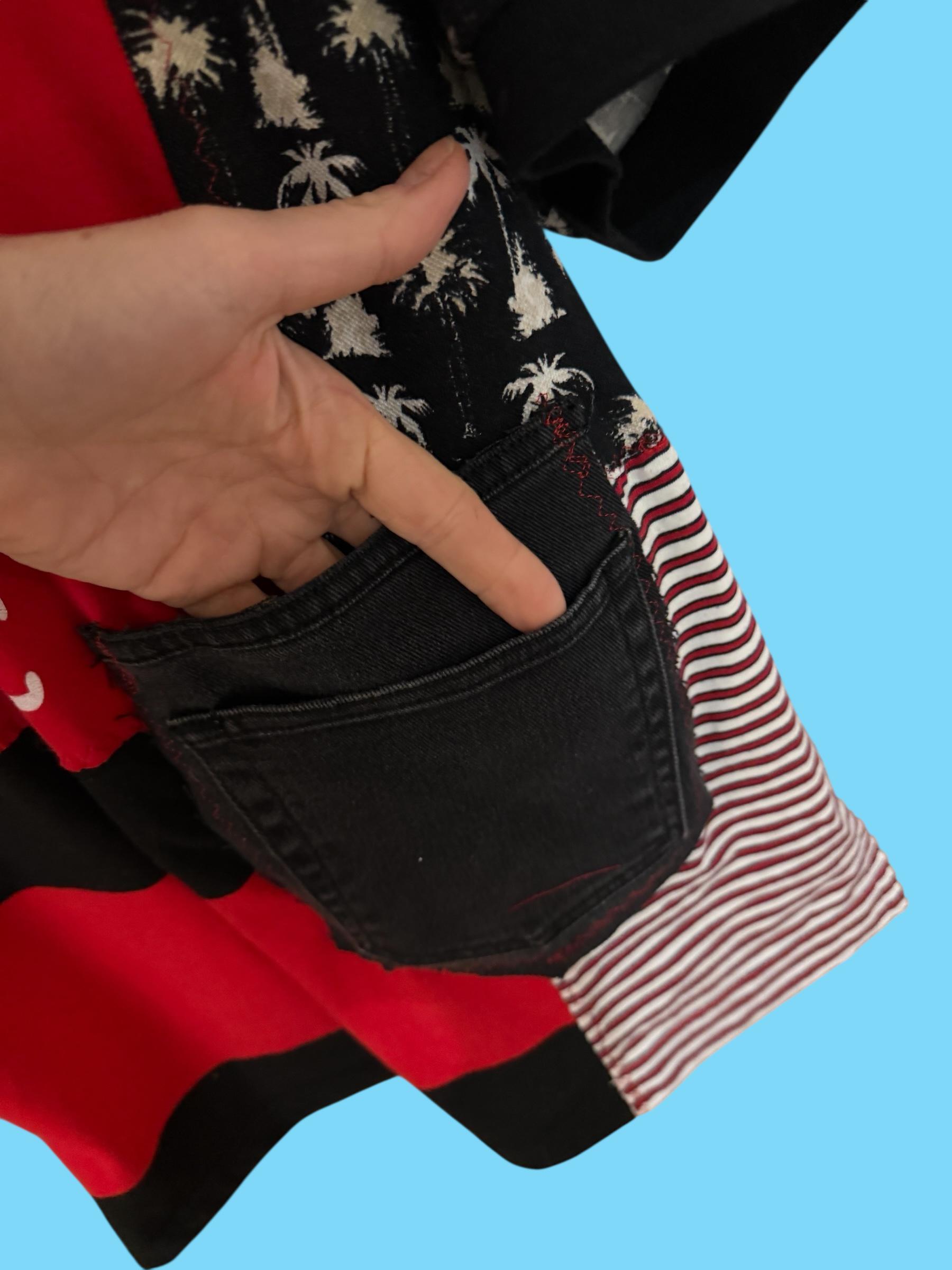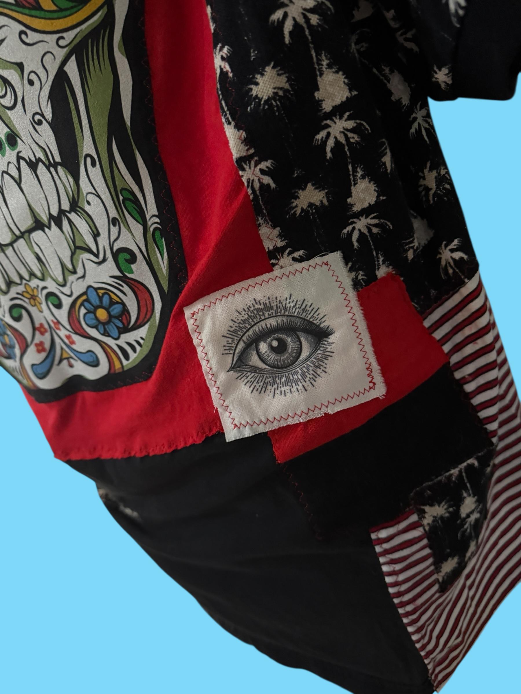 This wild YING and YANG shirt was up-cycled with lots of t-shirt fabrics and graphics. I added a lot so ck out photos. There is a double pocket as well. This is long enough for a short dress if you like. I cut the neck out for a softer look. There is a huge Day of the Dead skull on the back, and eye, smily face and hearts. This tunic is going to fit oversized and baggie. The sewn edges are raw but will not fray except the pocket which is black denim. Any questions, just ask!